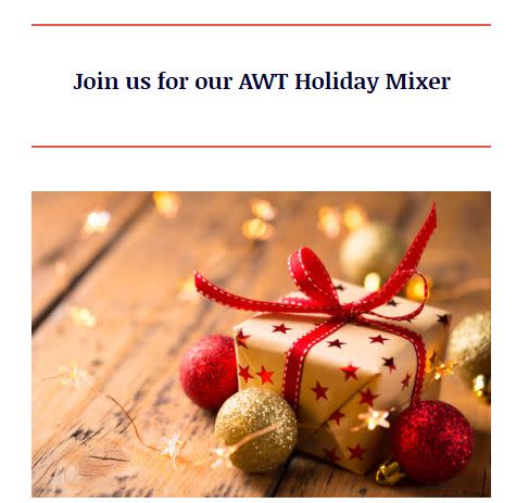 Please join us for our in-person AWT Holiday Mixer! There will be heavy hors d'oeuvres, beer and wine, networking, a 50/50 raffle and a brief presentation by AWT. The dress code is casual/business casual.